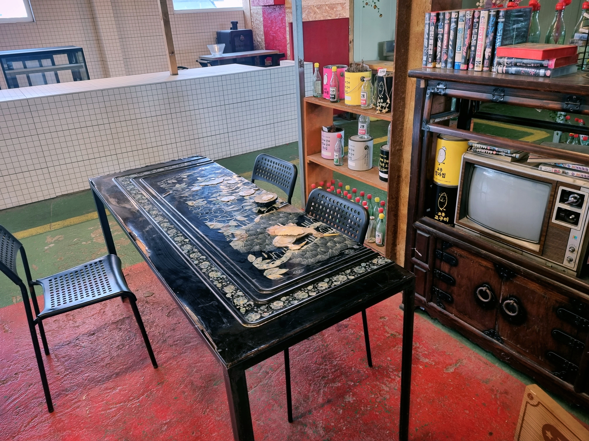 옛날 장롱 자개를 상판으로 만든 테이블인데 왠지 촌스럽지 않고 예뻤어요. 기발하네요. 😅