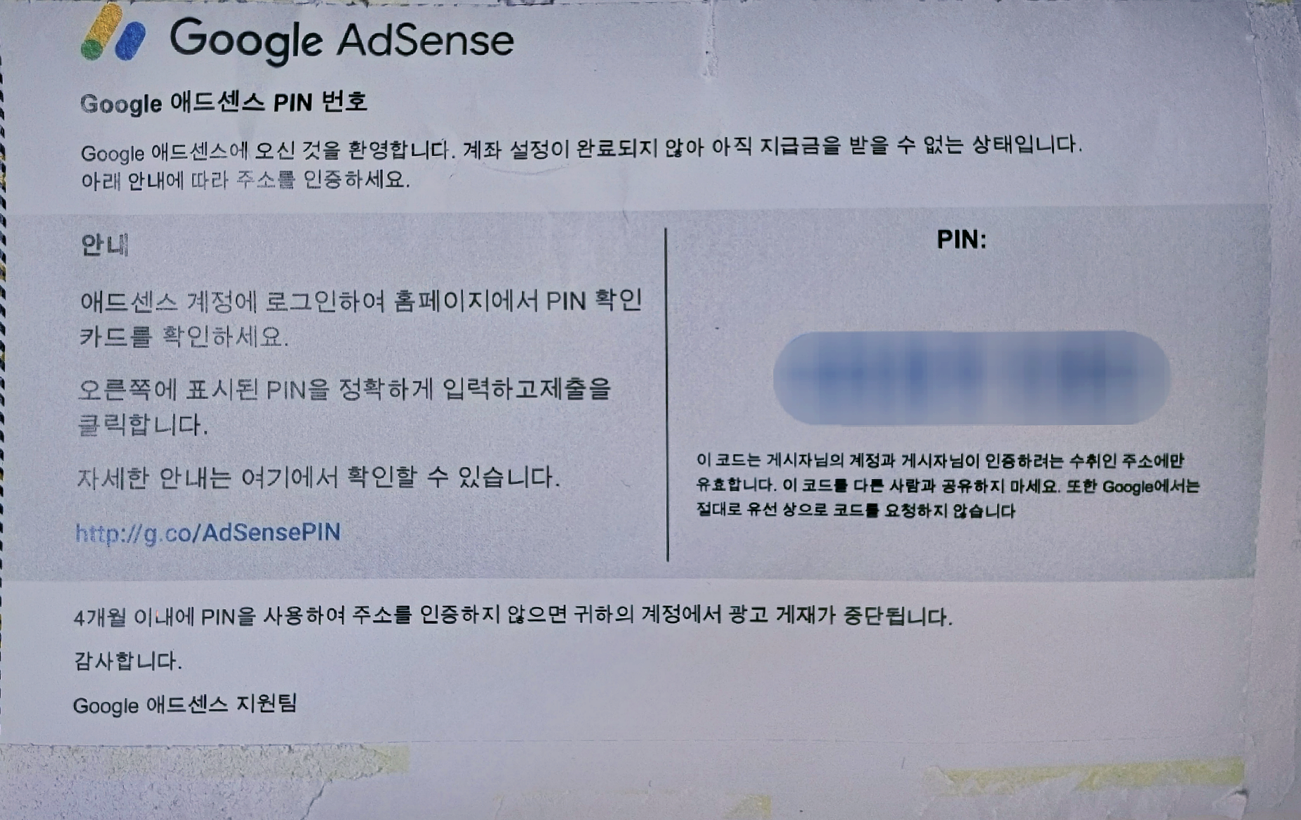 구글에서 애드센스 잔고가 10달러 이상이 되면 애드센스에 등록된 집 주소지로 핀 번호를 우편으로 보내 줍니다.