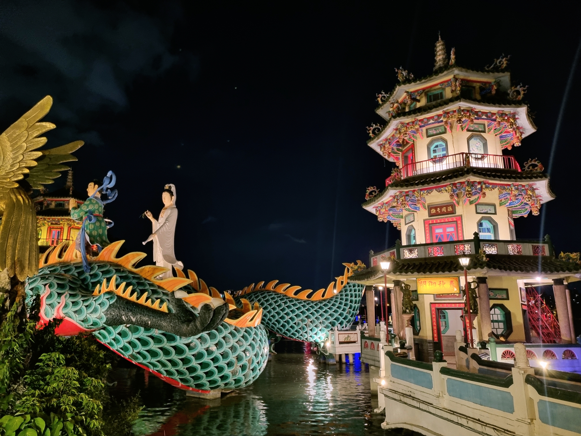 호수 위 거대한 용과 조각상들 조화로워서