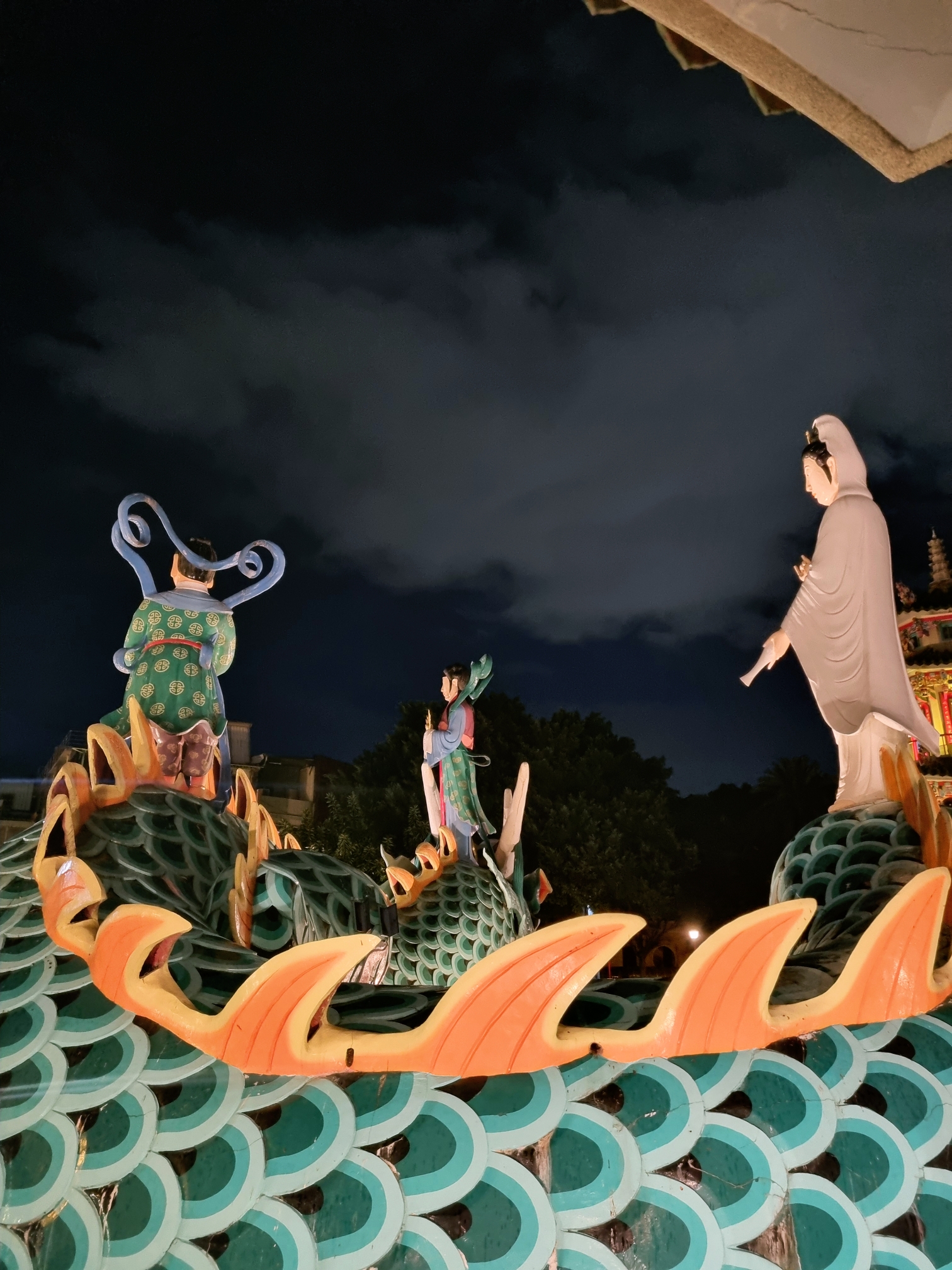 용 조각상과 탑을 바라보는 풍경이