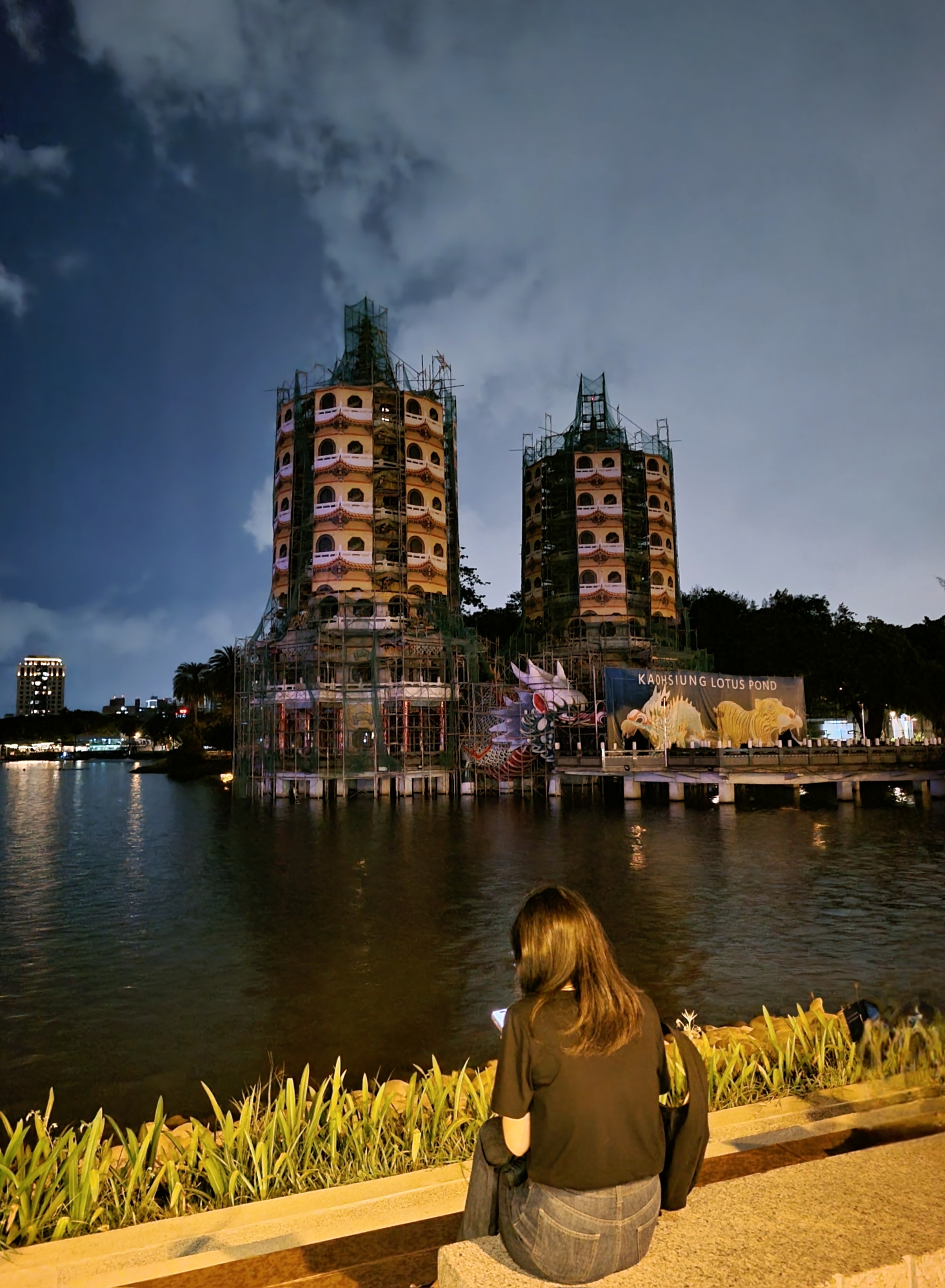 잠시 공사 중인 용호탑을 바라보고 앉아