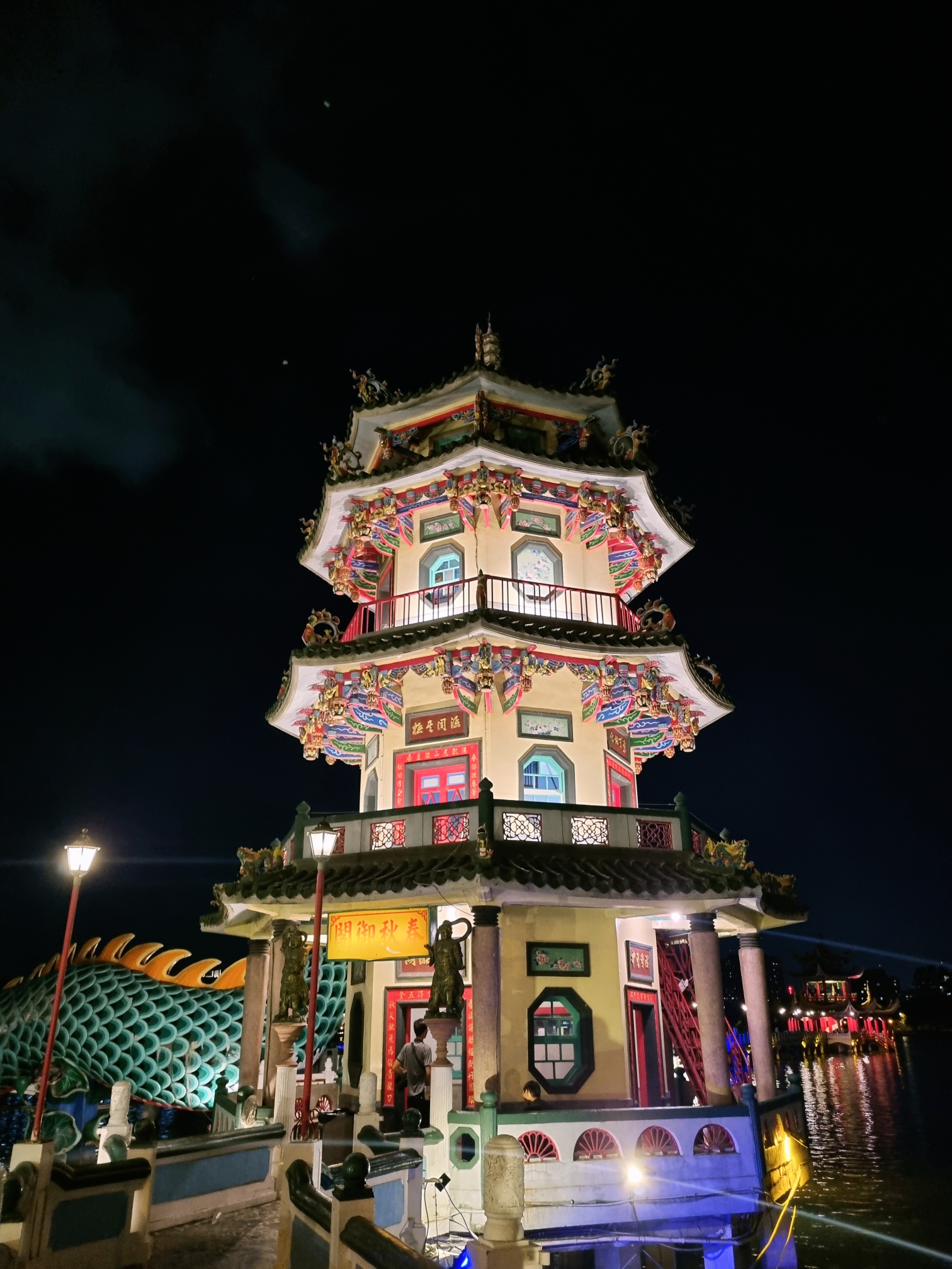 용 조각상과 탑을 바라보는 풍경이