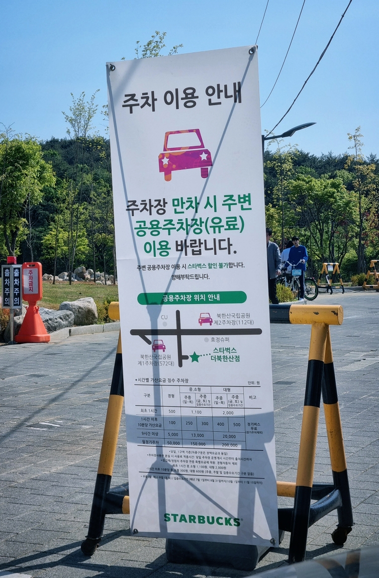 스타벅스 더 북한산점은 주차장이 꽤 잘 갖춰져 있는데요. 워낙 방문하는 사람들이 많아서 상시 만차라고 하더라고요.