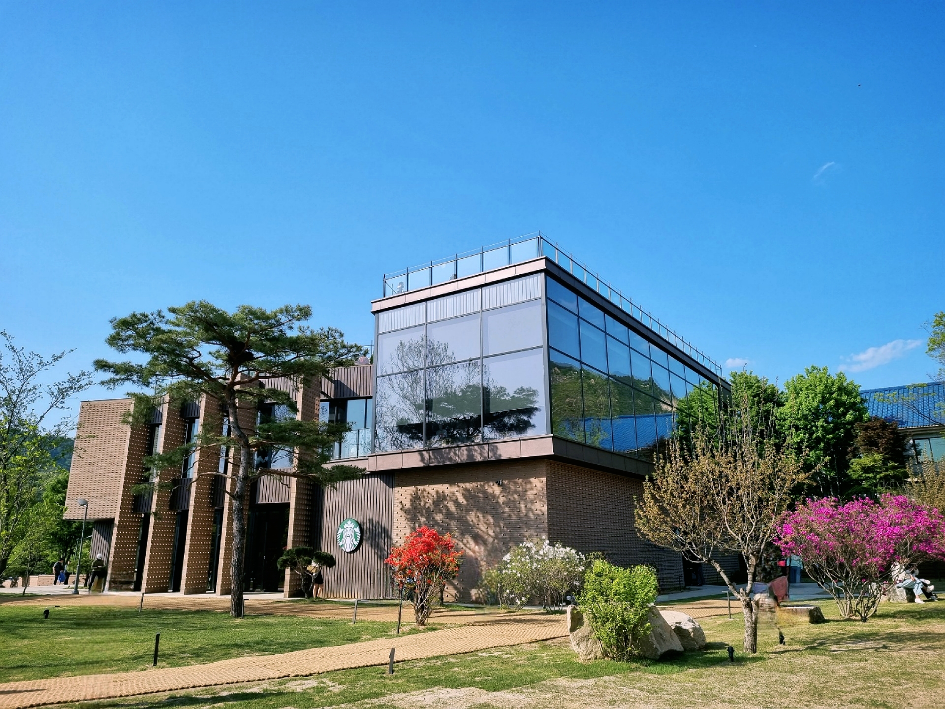 파란 하늘과 예쁜 조경, 시원하게 건축된 건물의 통유리까지 마치 갤러리 건물 같기도 하네요.