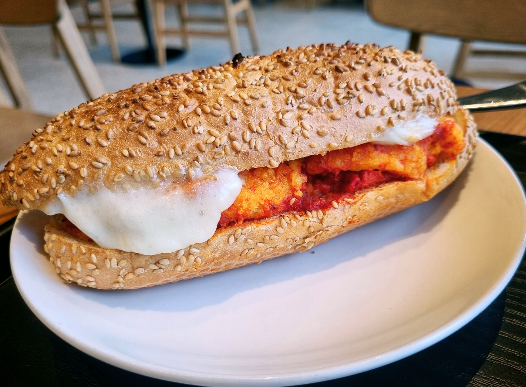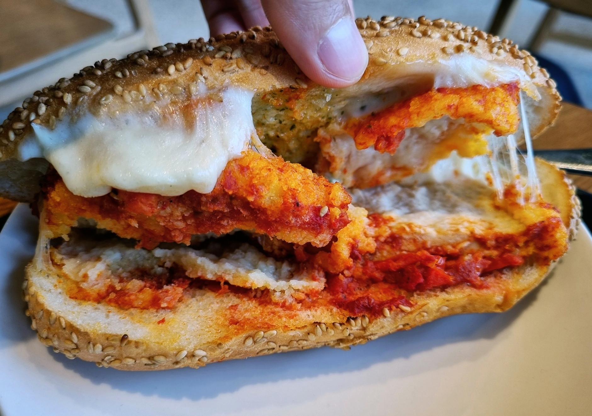 넓적한 치킨 패티 위아래로 토마토 베이스의 소스가 치덕치덕 발라져 있었어요. 모짜렐라 치즈는 위아래 부분에 얹어져 있고 가운데 부분엔 치즈가 비어 있네요.