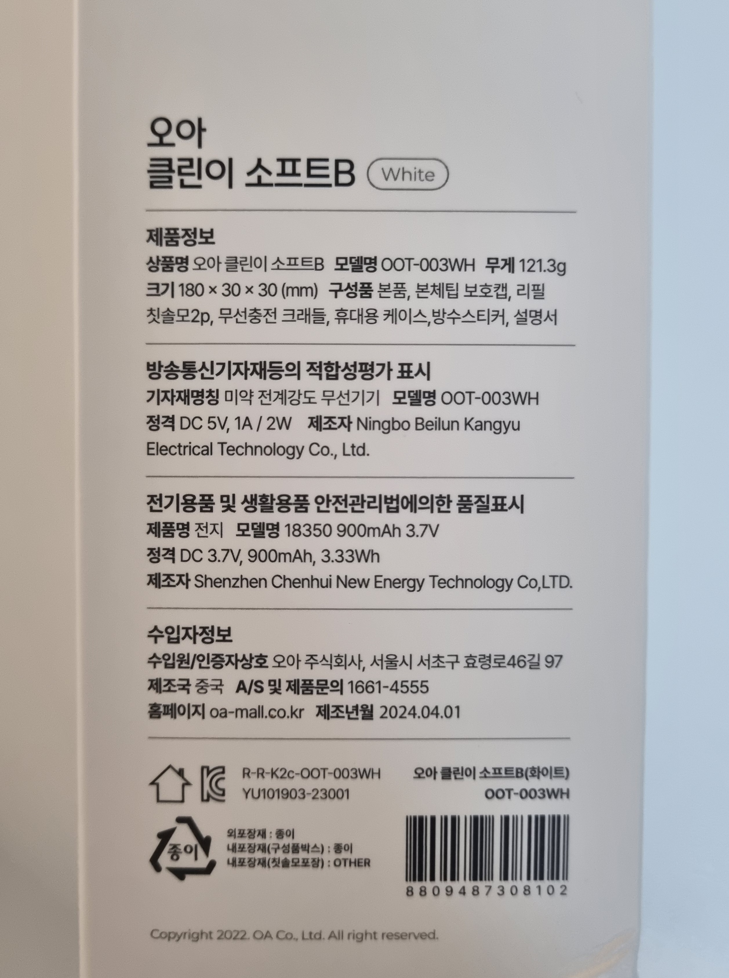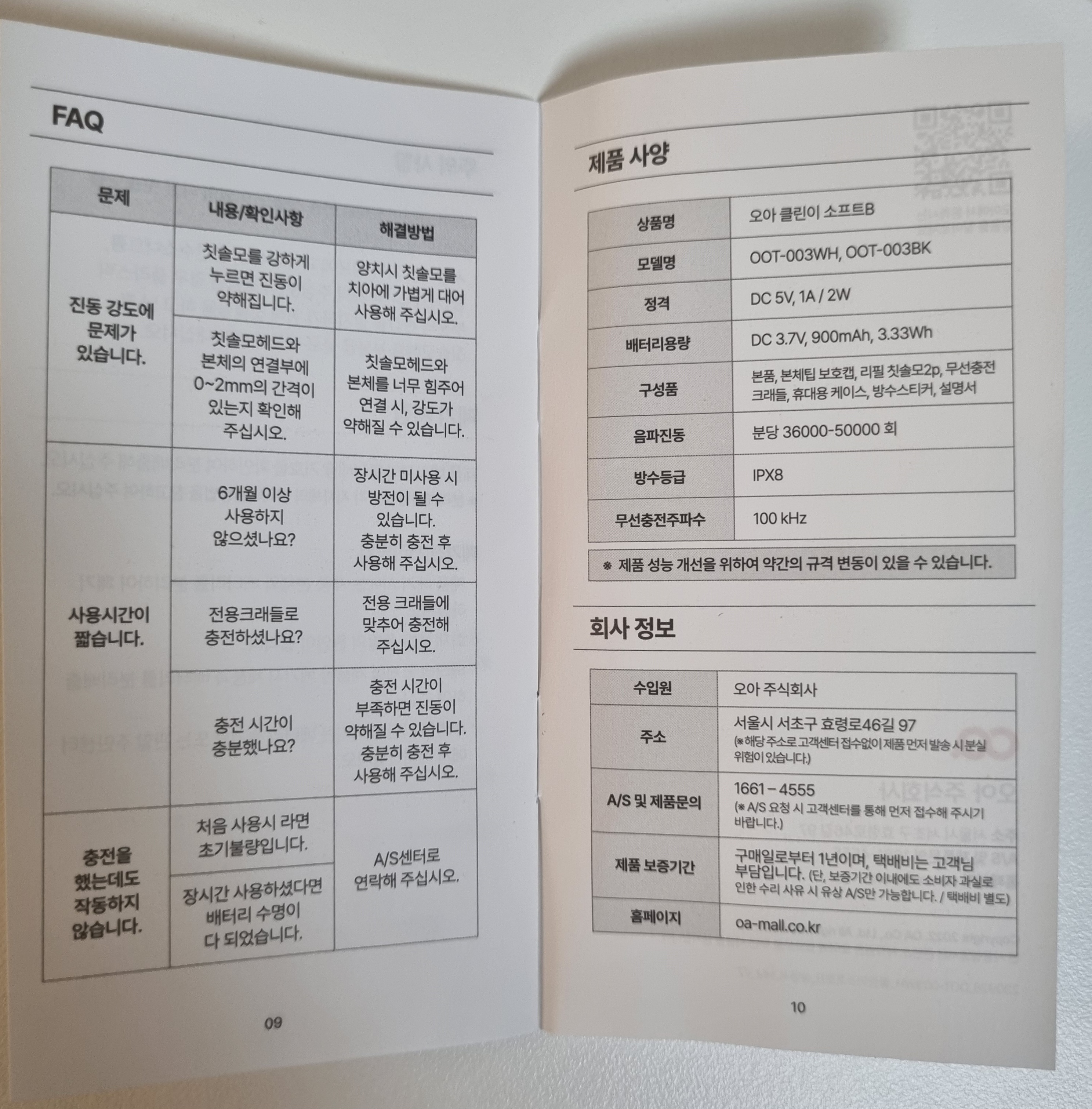 오아라는 회사에서 만든 클린이 소프트 B(OOT-003WH)라는 모델명의 진동칫솔인데요.