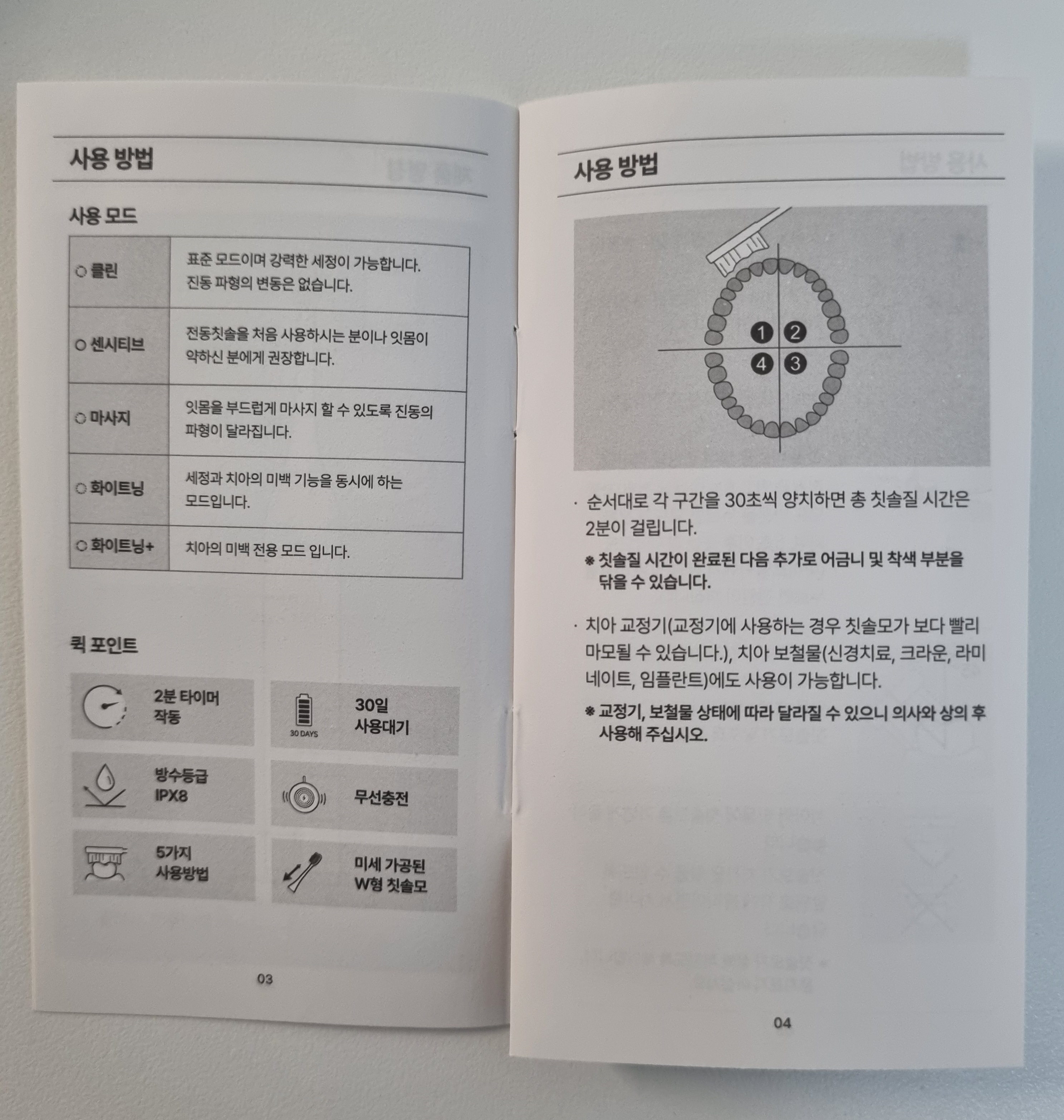 한 자리에 2초 정도씩 진동에 의해 양치질이 제대로 닦일 수 있도록 움직이면서 닦지 말아야 합니다.
