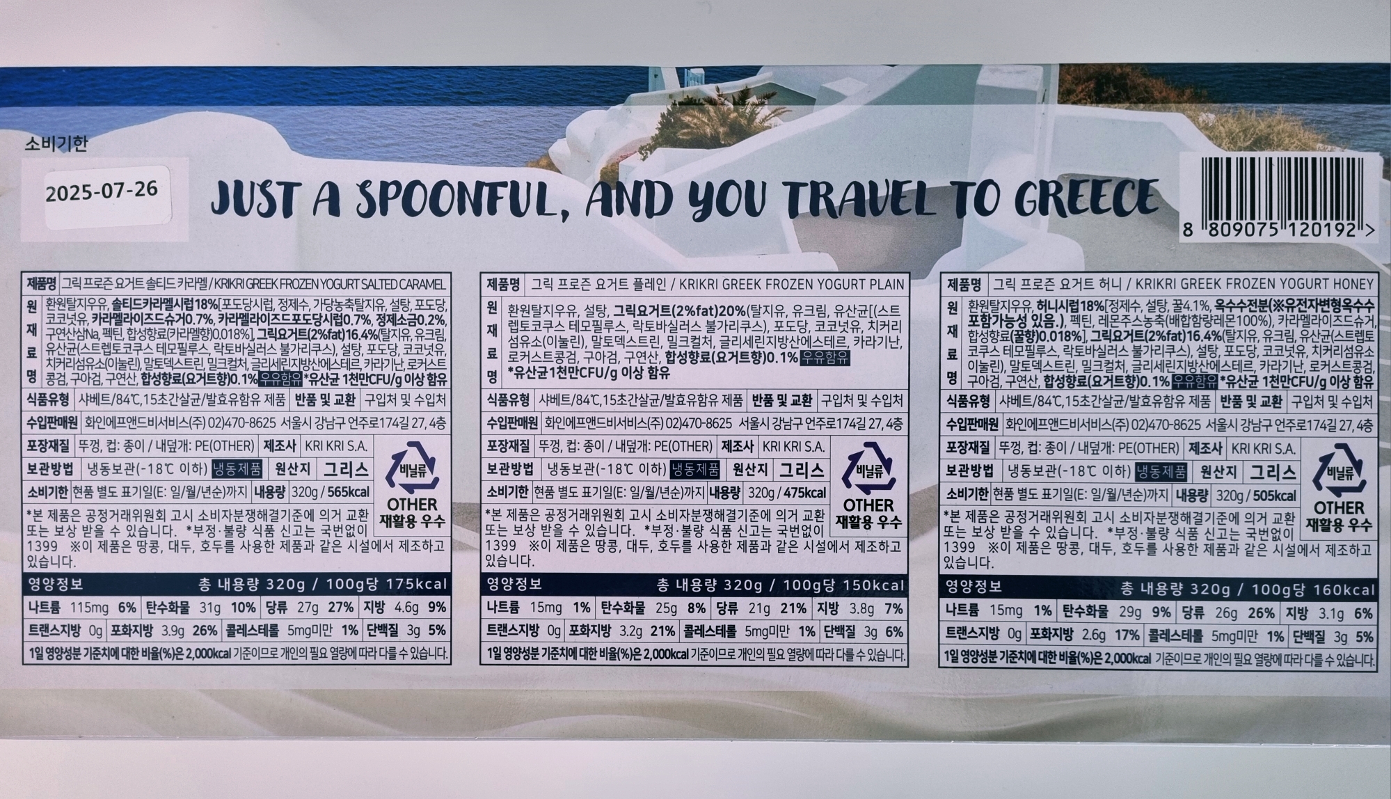 크리크리 그릭 프로즌 요거트 제품의 원재료명등 상세 정보가 박스 뒷면에 적혀 있어요.