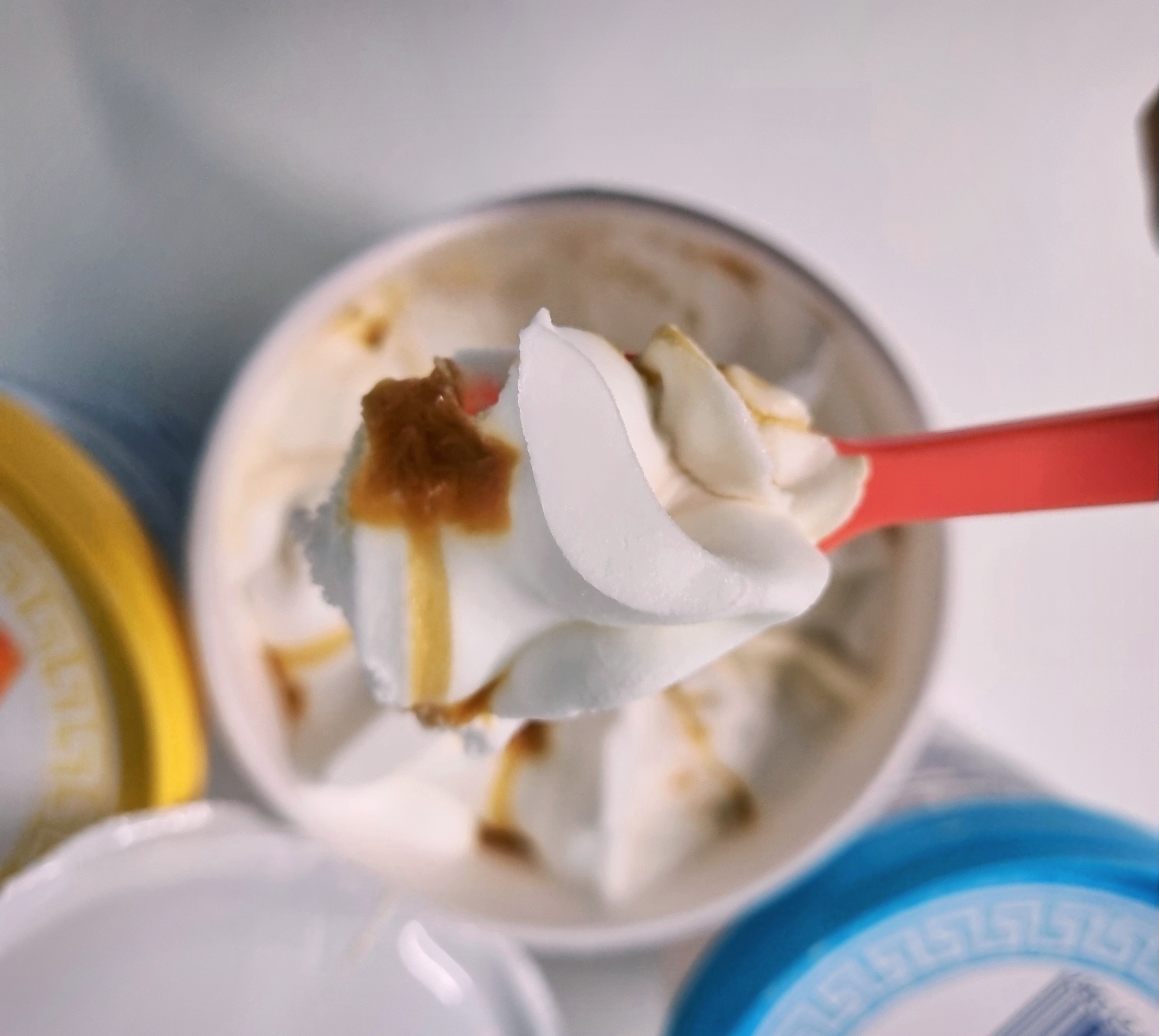 진한 요거트향을 가득 품은 아이스크림 사이에 달콤한 솔티드카라멜이 박혀있는데 요거트 향이 강하다 보니 카라멜 맛은 잘 느껴지진 않았어요.