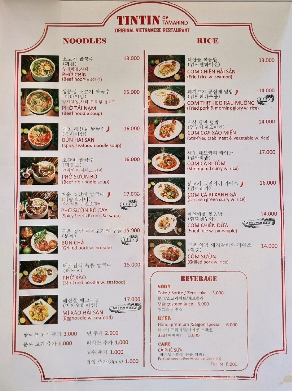 저희는 국물 요리를 좋아해서 소고기 쌀국수인 퍼친과 매운 해산물 쌀국수인 분하이산을 주문했어요.