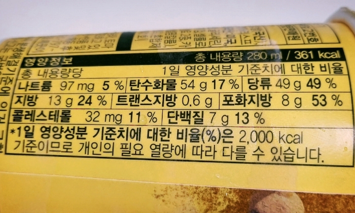 칼로리 361Kcal, 당류 49g, 포화지방 8g 등등..