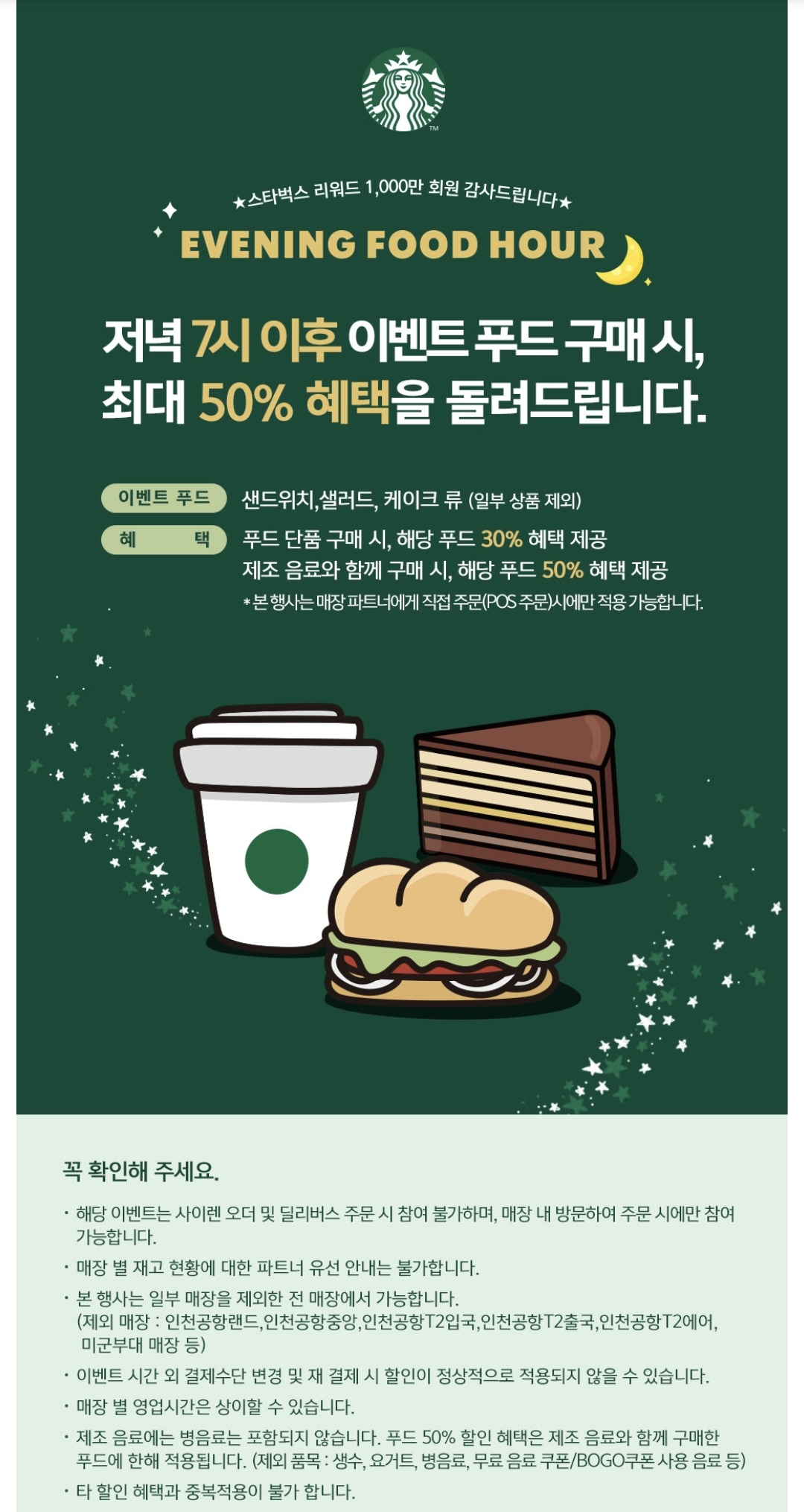 저녁 7시 이후부터 샌드위치나 샐러드, 케이크류 등 이벤트 푸드 메뉴 구입 시 할인을 해준다는 소식인데요. 파트너가 제조하는 음료와 푸드를 같이 구매하면 50%나 할인된 금액으로 구매가 가능하다고 합니다.