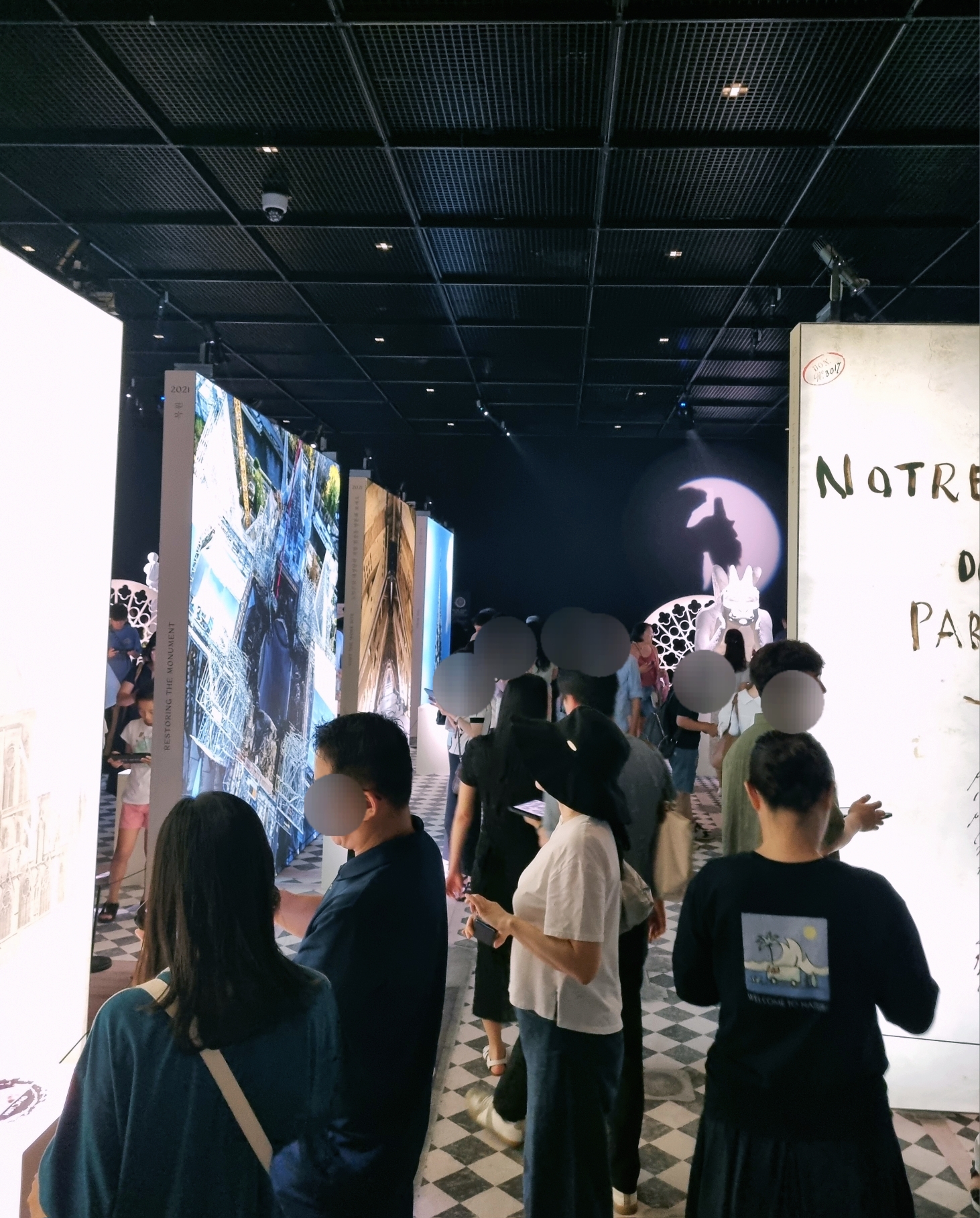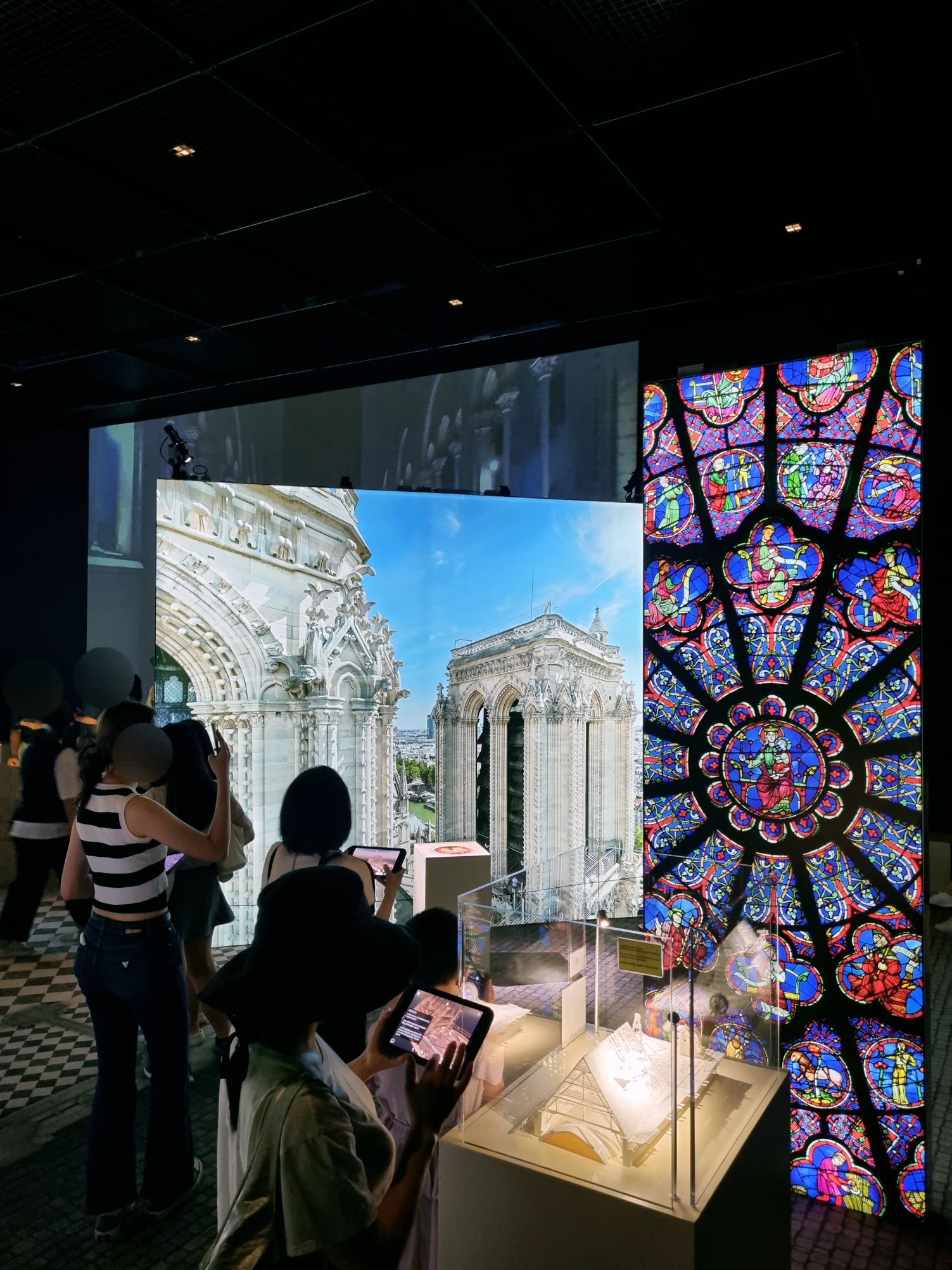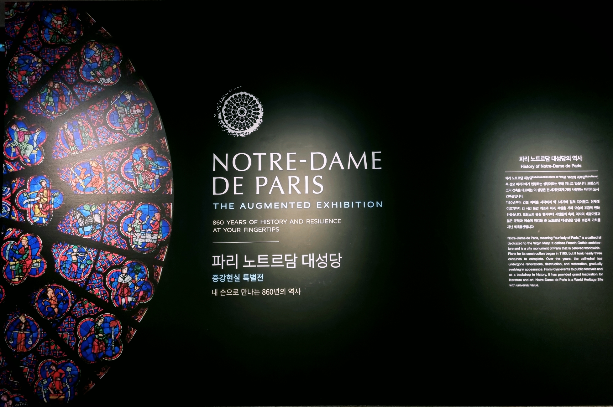 2019년 화재로 복구 중인 노트르담 대성당에 대한 주제로 1163년 착공부터 지금까지 복원 과정을 영상과 사진을 통해 증강현실로 구현해 낸 전시예요.
